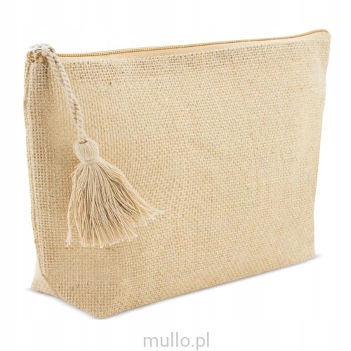 Oryginalna, modna kosmetyczka została wykonana z juty. Główna komora zapinana na zamek błyskawiczny. Kosmetyczka została wykończona podszewką. Zawiera pompon, który nadaje jej bardzo charakterystycznego wygladu.